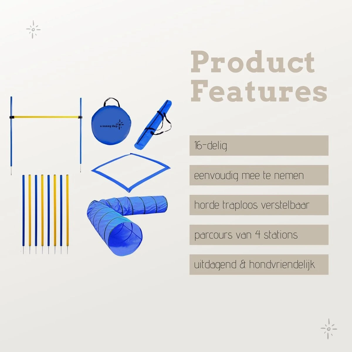 Tijd om samen plezier te maken, door je hond al spelend te trainen dankzij deze agility set voor honden. De set bestaat uit een parcours van vier stations: een tunnel, acht slalompalen, een horde set en een startveld. Boost het zelfvertrouwen en de fitheid van je hond dankzij de veelzijdige trainingsmogelijkheden van deze agility set.