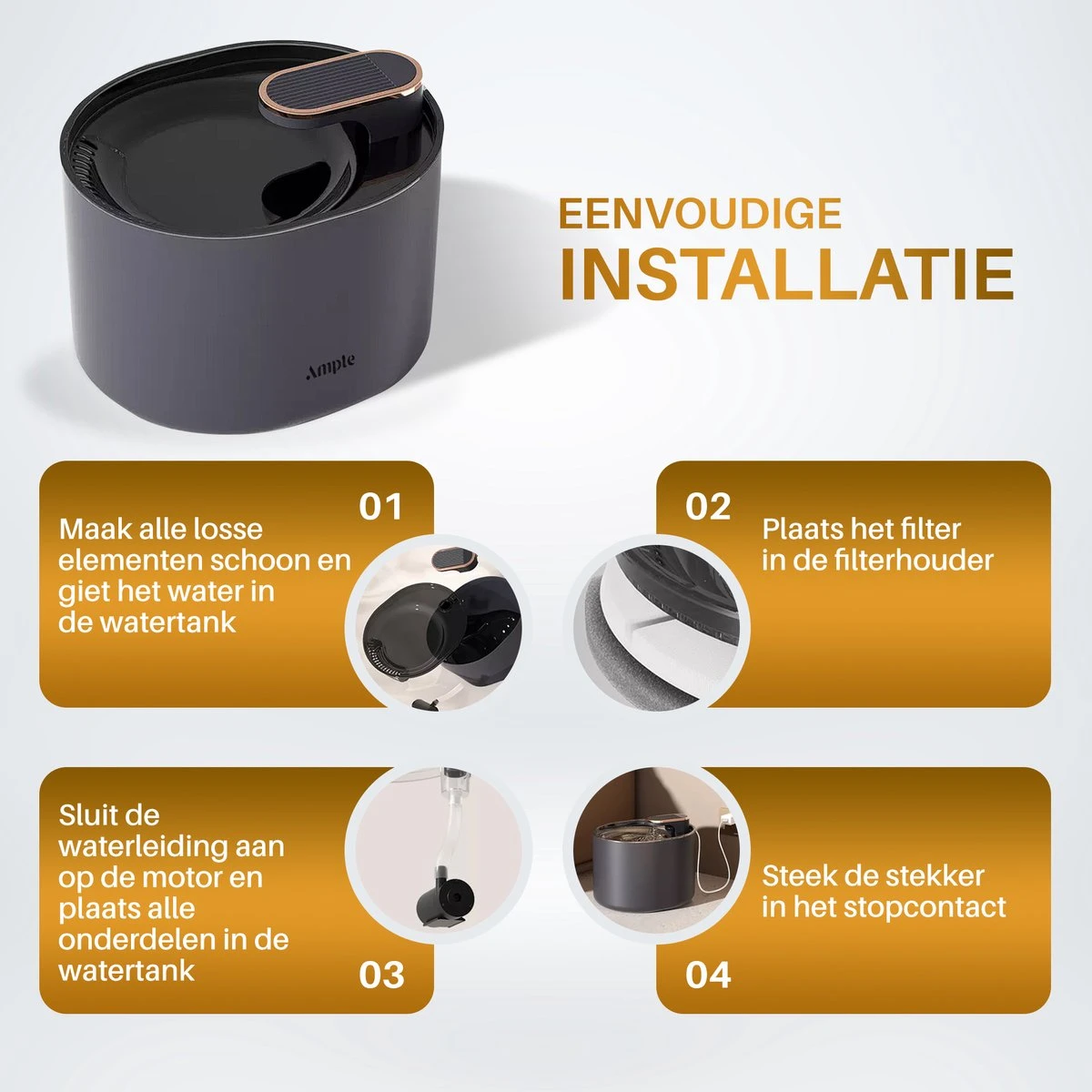 Klinkt het als muziek in jouw oren om je geen zorgen meer te maken over de gezondheid van jouw huisdier? Of om niet meer na te hoeven denken of jouw hond of kat wel genoeg drinkt? Of dat er niet te veel kalk in het drinkwater zit? Dat snappen wij bij AMPLE als geen ander! Daarom hebben wij speciaal voor jouw huisdier de AMPLE drinkfontein in het leven geroepen.