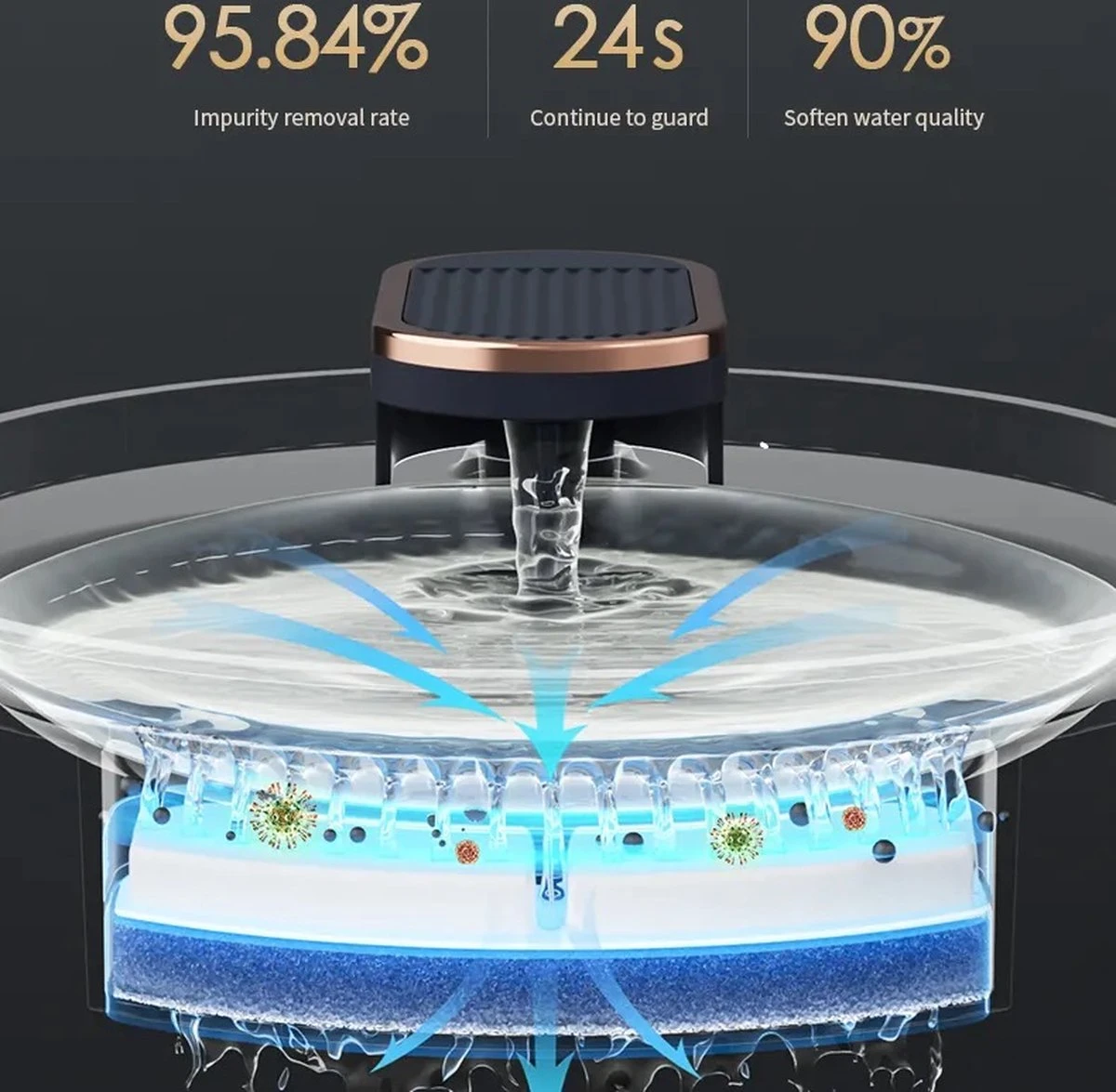 Door het 3-laagse filtersysteem wordt het water zo optimaal mogelijk schoongehouden. De eerste laag van het filtersysteem zorgt ervoor dat de haren worden gefilterd. De tweede laag zorgt voor de verwijdering van chloor en zware metalen en de derde laag zorgt ervoor dat de smaak van het water goed blijft. Door de drielaagse filtering is je kat altijd voorzien van schoon en smaakvol water.