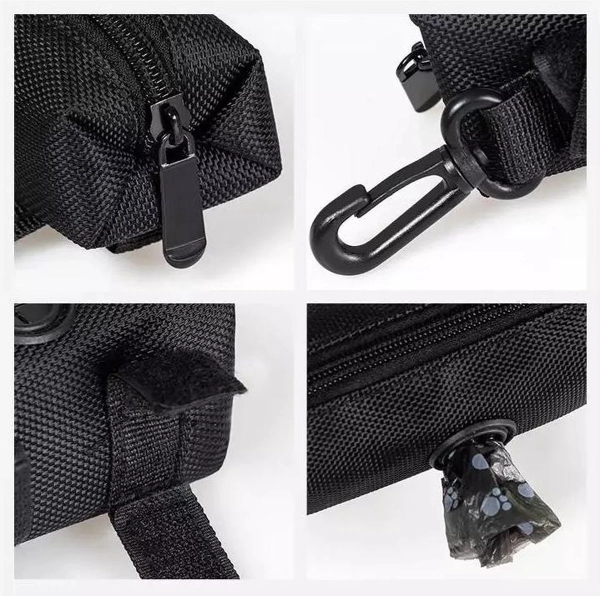 - De poepzakjeshouder wiebelt niet aan de riem door de bevestiging op meerdere punten;