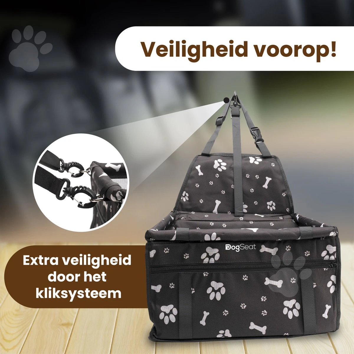- Veiligheid voorop. Door het kliksysteem kunt u uw hond aan de stoel bevestigen en hoeft u zich geen zorgen te maken tijdens het rijden dat uw hond zich verplaatst.