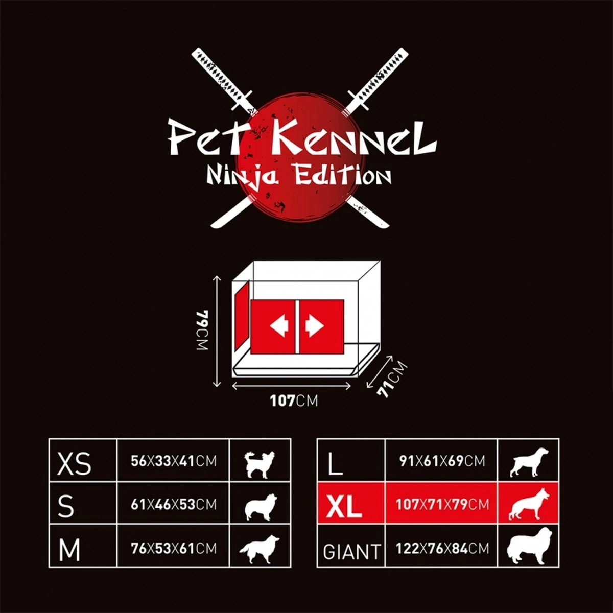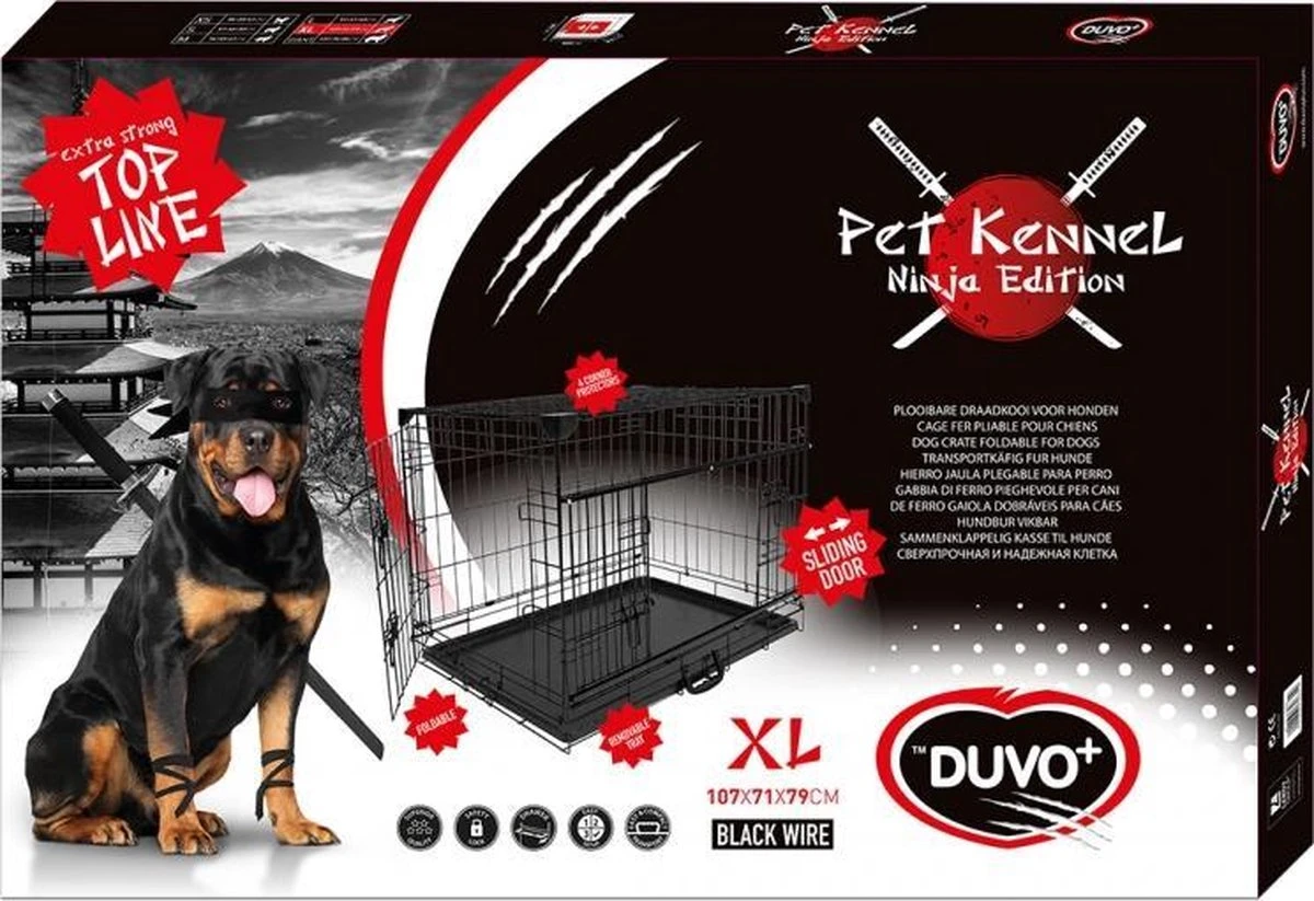 Deze ‘Limited Ninja Edition’ draadkooi van Duvo+ is niet voor doetjes. De 4 hoekbeschermers en de dikkere draad maken deze draadkooi heel robust en inzetbaar voor alle hondenrassen. Heel handig in gebruik, want naast een gewone deur op de korte zijde, is er een gepatenteerd schuifdeur-systeem waardoor de bench ook in kleine ruimtes of bij transport in de wagen kan worden gebruikt. Makkelijk inklapbaar, met draadhandvat en plastic lade.