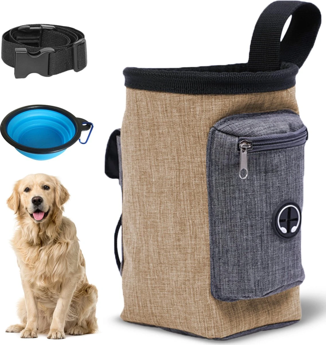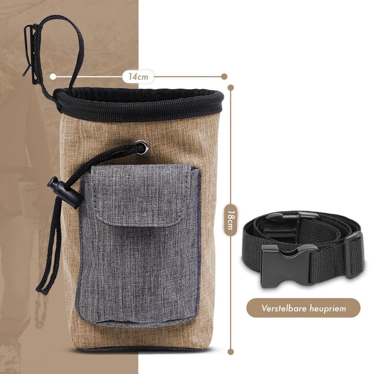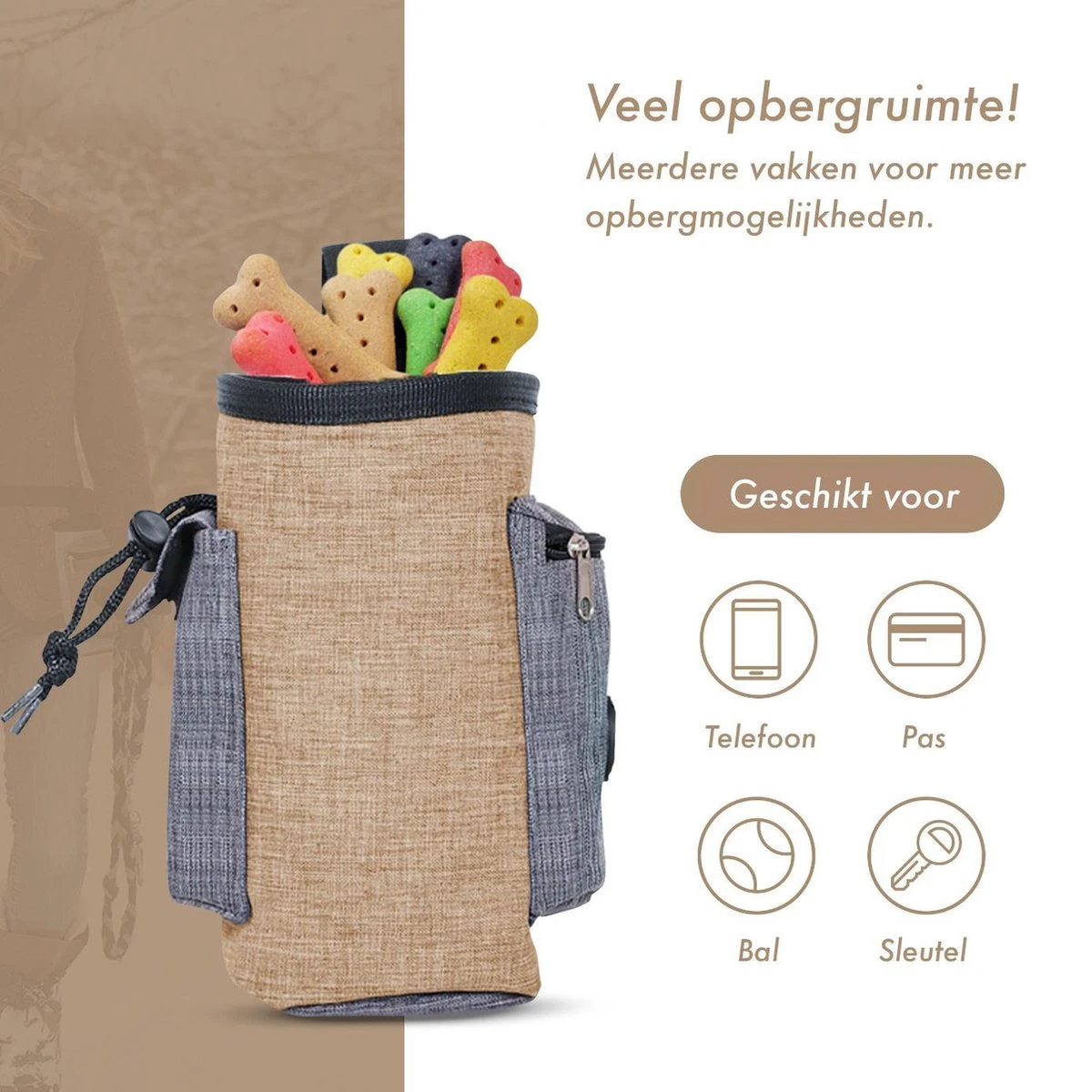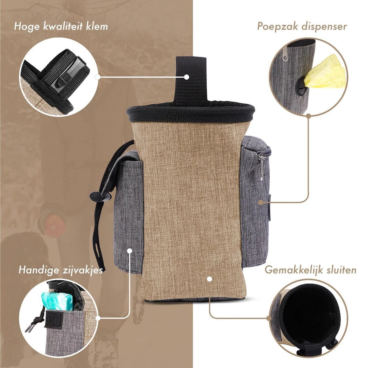 Je kan hier gemakkelijk hondensnoepjes in bewaren, daarnaast bevat dit tasje ook een dispenser voor poep zakjes zodat je deze ook altijd bij de hand hebt.