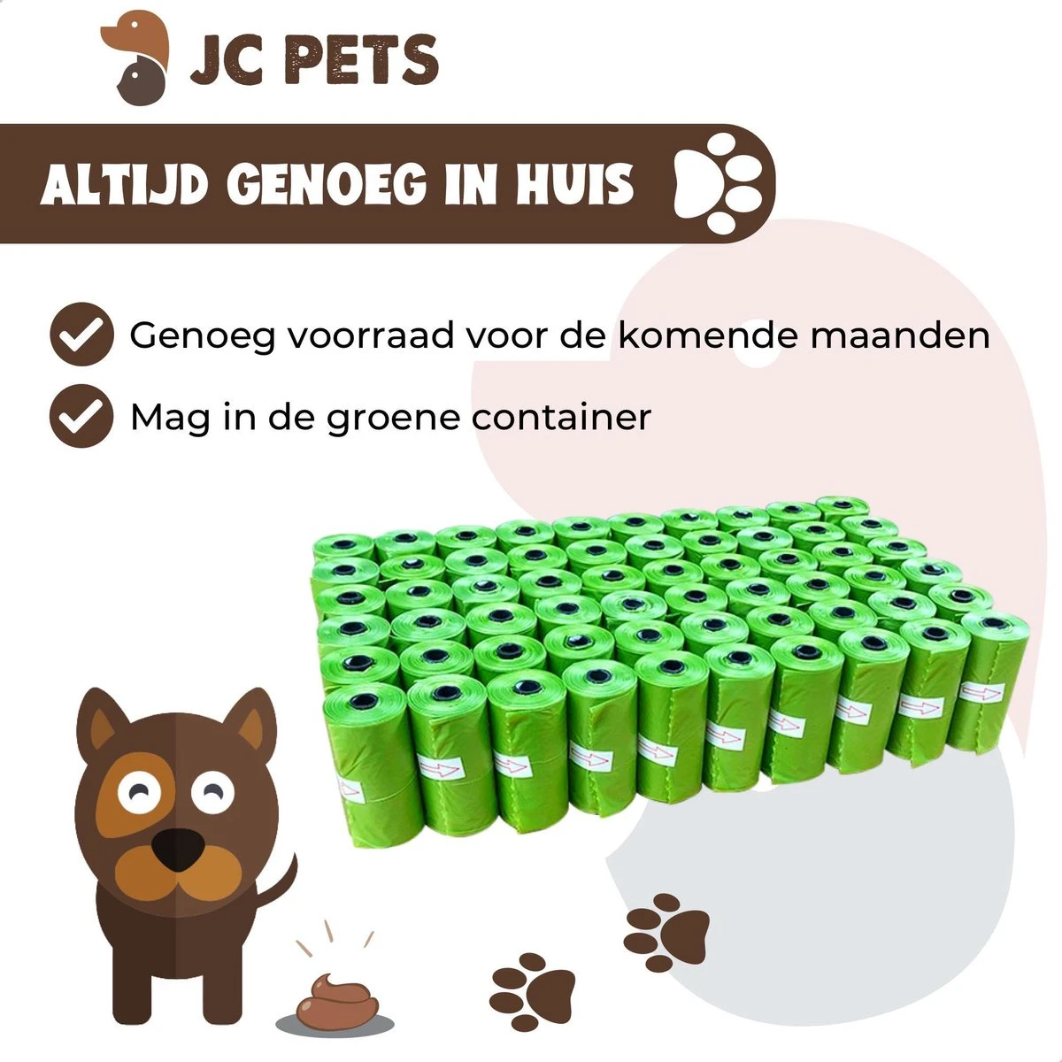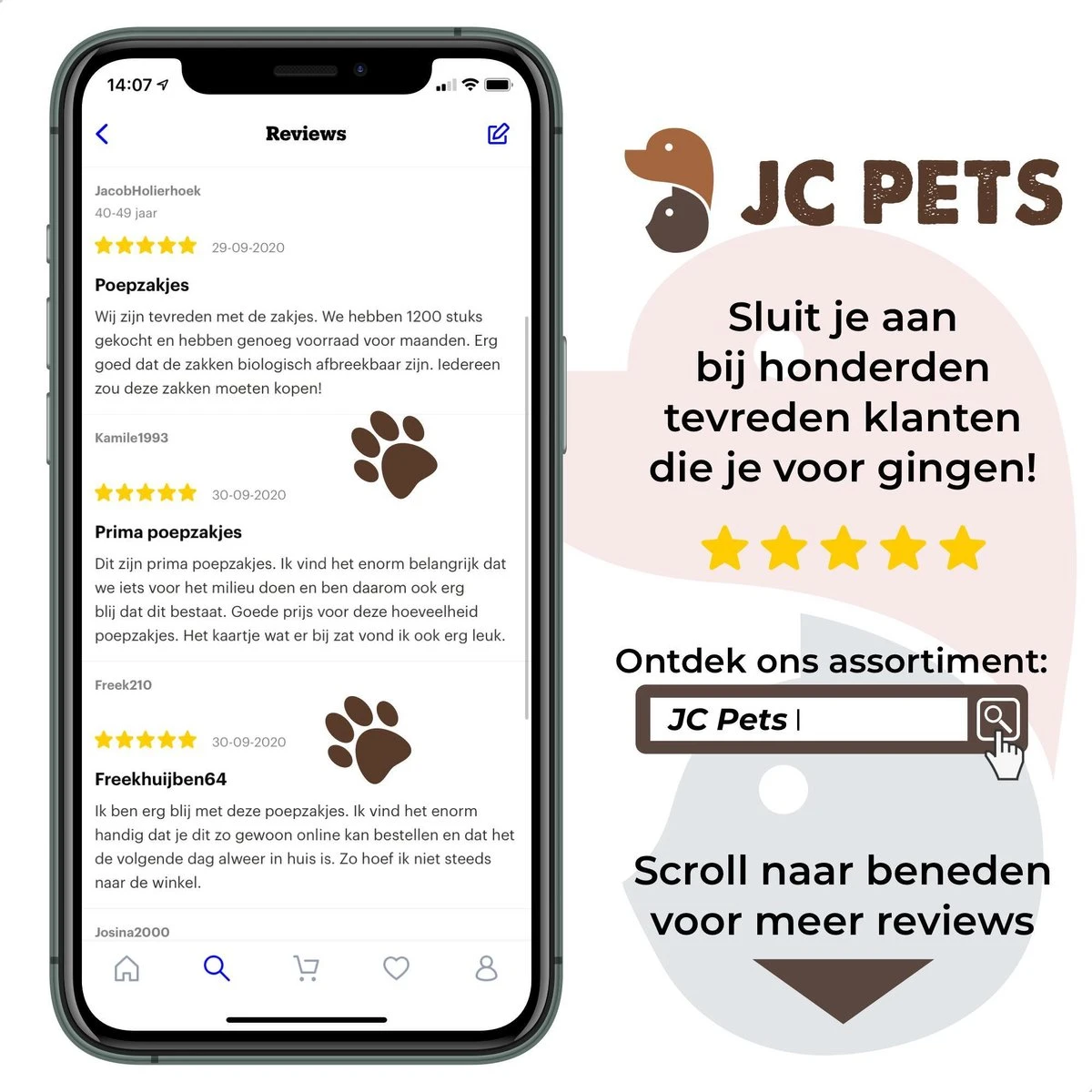 De JC poepzakjes zijn de enige poepzakjes die 100% recyclebaar zijn en daardoor gewoon in de groene container kunnen. De poepzakjes zijn van stevig materiaal gemaakt, waardoor ze niet doorscheuren. Ideaal om mee te nemen tijdens een lange wandeling met je hond. Gun jezelf een rustige wandeling met je hond zonder zorgen over het moeten opruimen van drollen.