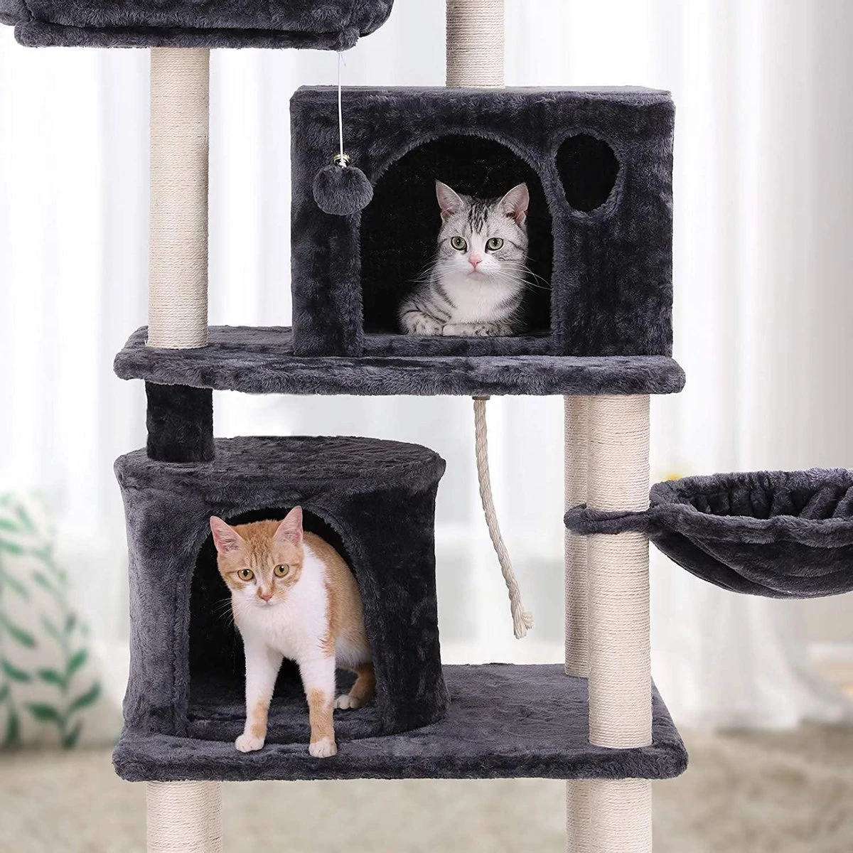 MET SPEELPLAATS OP DE GRONDVLOER: Naast comfortabele rustplaatsen in het bovenste gedeelte van de krabpaal is er een spannende speeltuin met een schuin geplaatste krabplank in het onderste gedeelte