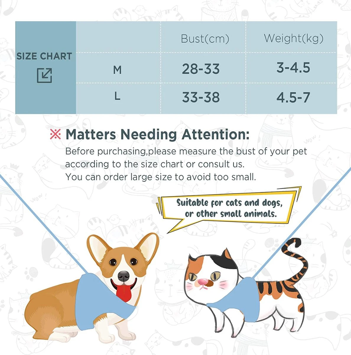 - Maat: M/L. Geschikt voor de meeste huisdieren. M: borst 28 – 33 cm; gewicht van de kat 3 – 4,5 kg. L: borst: 33 – 38 cm; gewicht van de kat 4,5 – 7 kg.