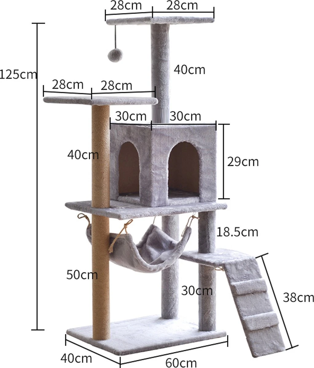 Het kattenmeubel heeft een eigen gewicht van 11 kg en meet 125 cm hoog, dat maakt deze krabpaal geschikt voor de normale volwassen katten.