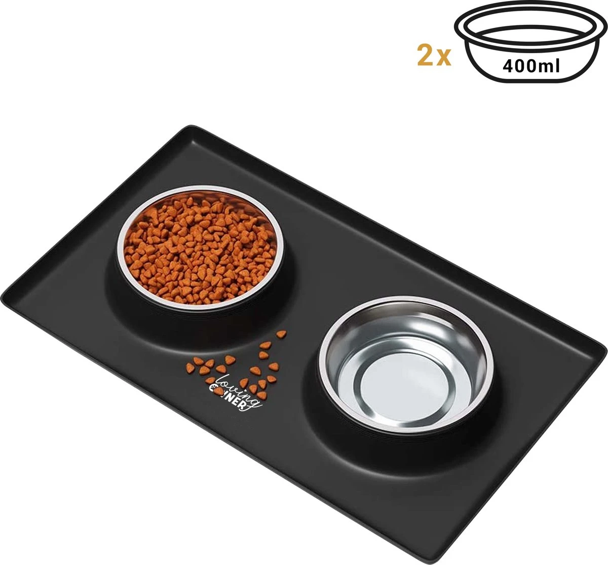De roestvrijstalen voerbakken en de siliconen mat zijn licht van gewicht en houden de perfecte hoeveelheid voedsel en water vast. De schaaltjes zijn stapelbaar en de anti-slip mat kan worden opgevouwen, zo is het gemakkelijk mee te nemen op reis.