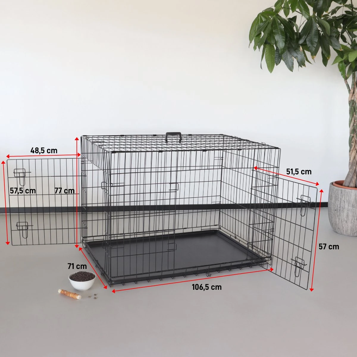 Deze hondenbench is gemaakt van metaal en heeft een stevige opvangplaat. Deze is uitneembaar, hierdoor kun je gemakkelijk ongelukjes opruimen. De bench is super sterk, hierdoor is deze voor zowel pups als volwassen honden geschikt. Zorg er voor dat de hond of elk ander dier altijd genoeg ruimte heeft om te bewegen!