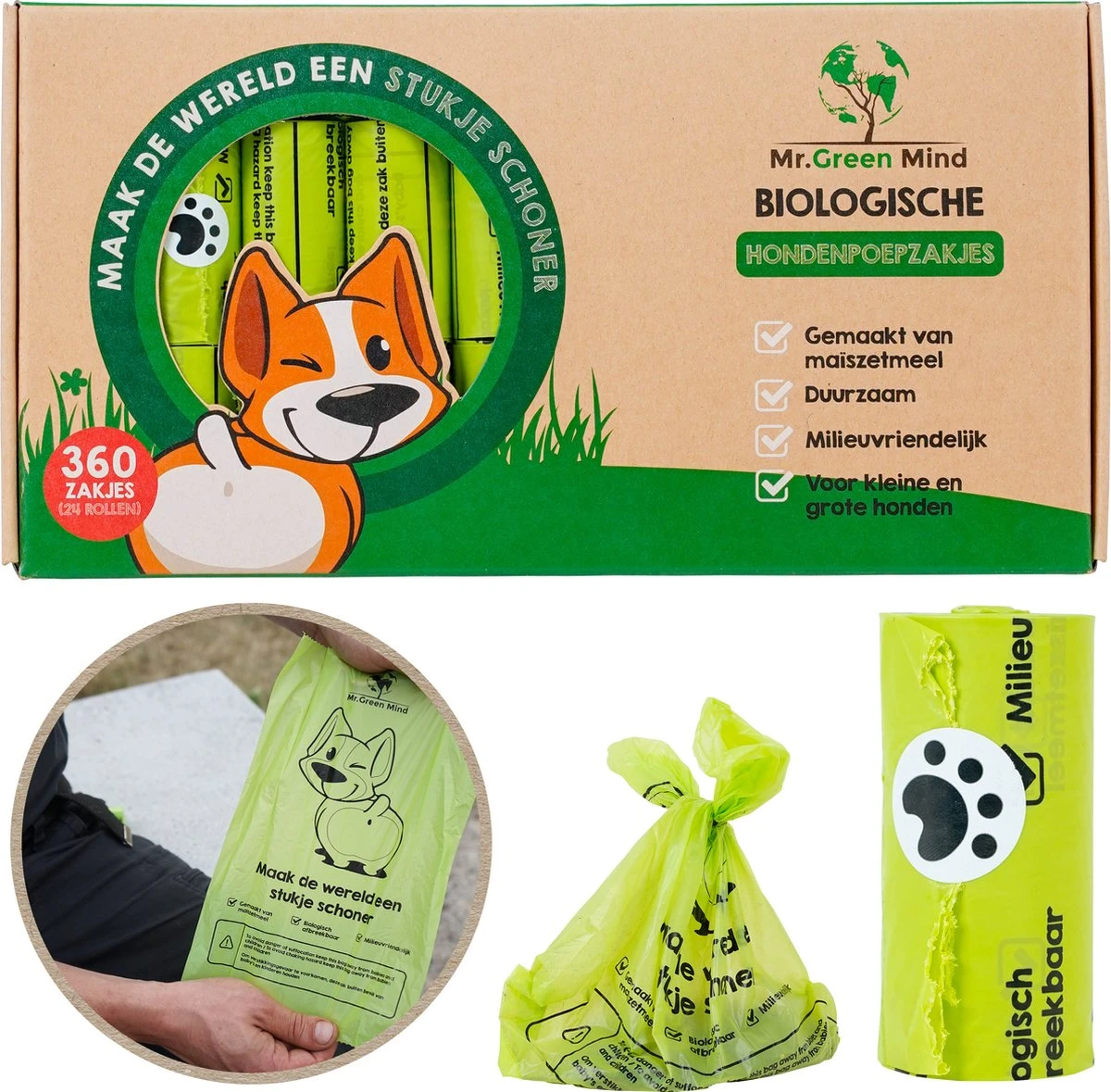 Pakket met 360 biologische zakken en 100% lekvrij garantie. We gebruiken gerecyclede materialen in onze verpakkingen en rolkernen omdat details belangrijk zijn. Onze zakken zijn van een dikkere en betere kwaliteit als van de concurrenten, voorzien van een verbrede verzegelde bodem. Ze zijn groot genoeg om je hand en mouw volledig te bedekken tijdens het oppakken, met voldoende ruimte over om een stevige knoop in de zak te leggen. Je bent goed voorbereid, ongeacht de grootte van de kak, van de meest majestueuze honden tot de kleinste puppy’s! Het is zelfs niet alleen voor hondenpoep maar ook voor huisvuil en dierenvoeding te gebruiken.