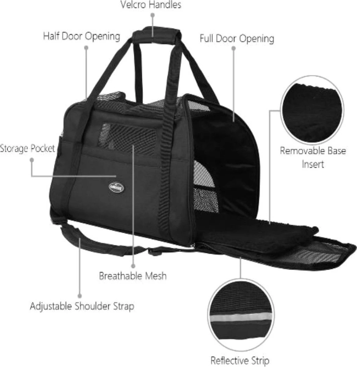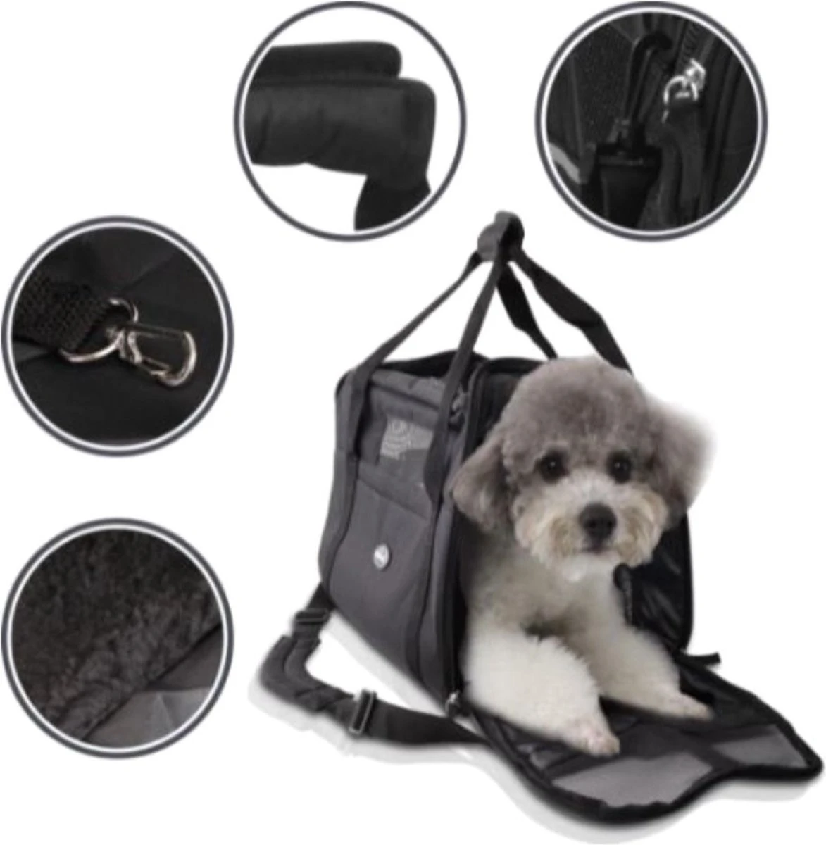 600D oxford cloth cover, tightly knit, durable and bite-resistant. Multiple pratical pockets for easy storage of snacks and toys. Soft and comfortable with velvety cushions at the bottom, connected by Velcro. Large independent space, eliminating anxiety of travelling. All around gird design, breathable,not suffocating. Velcro handle, protect hands without feeling tight. Buckle inside the bag for buckling the dog collar to avoid the dog running around.