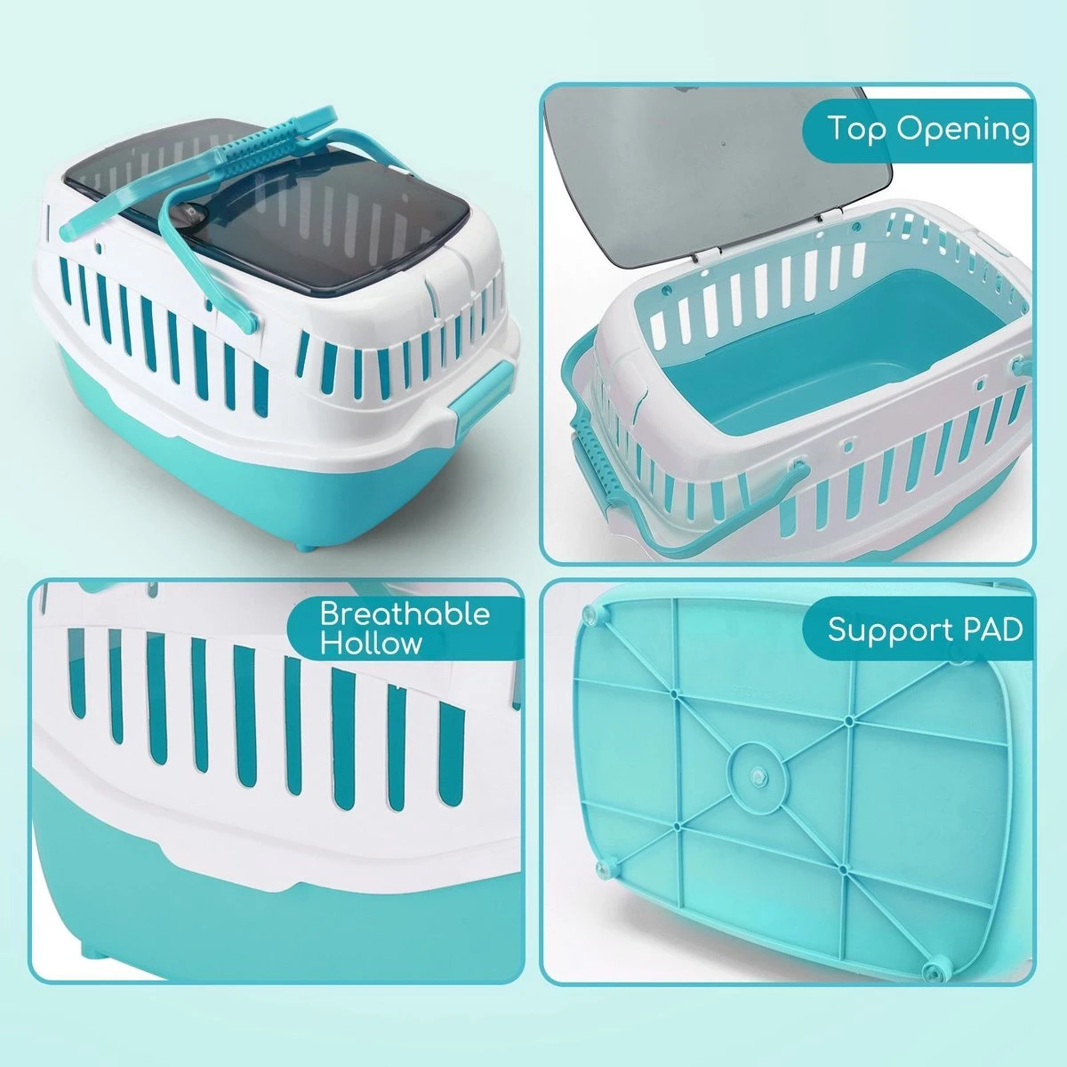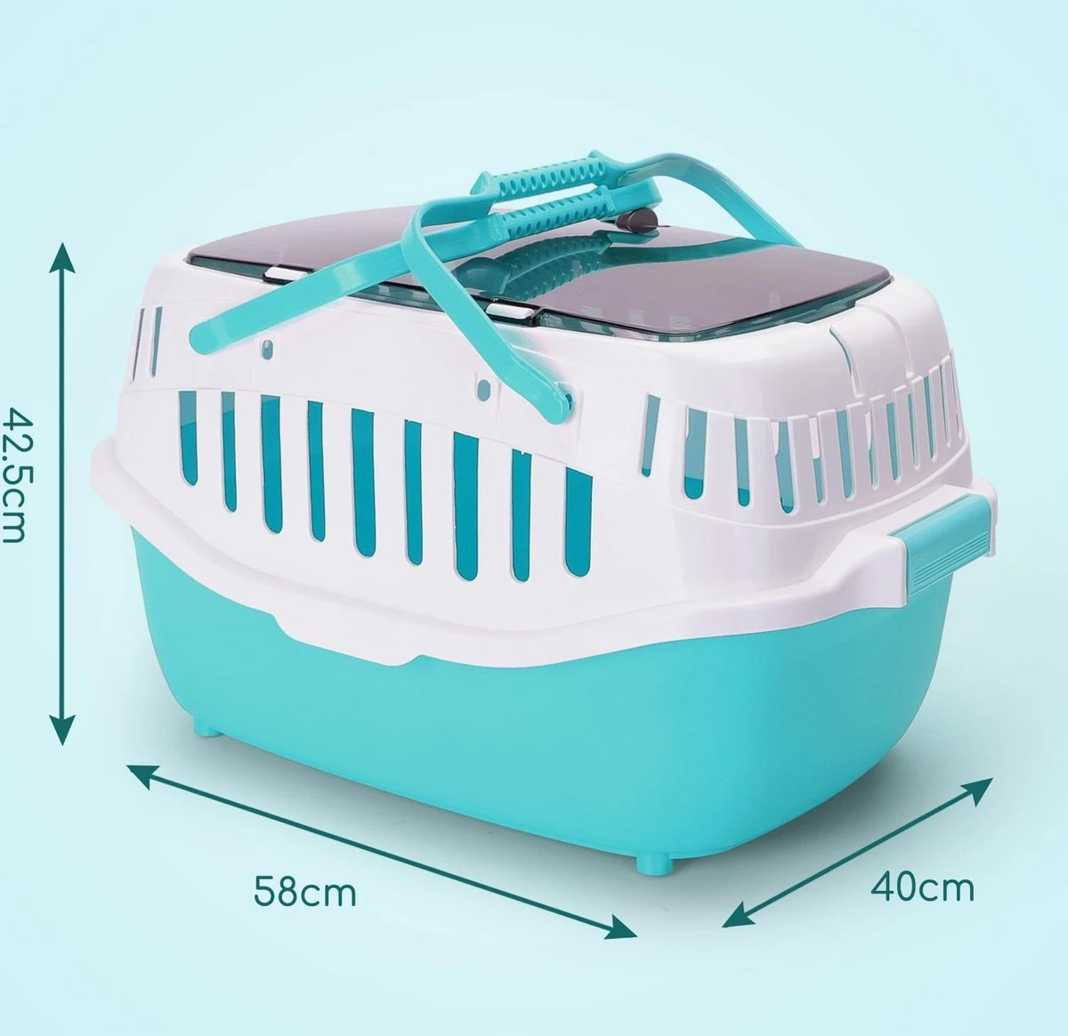 Draagbaar reishuis voor huisdieren. Het bovenste dakraam is goed afsluitbaar en eenvoudig te openen om je hondje of kat in te laden.