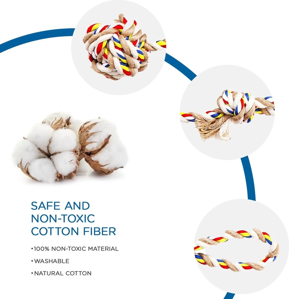 - Als katoenvezels afbreken doen ze dat in hele kleine stukjes die daardoor niet snel schade veroorzaken als ze worden ingeslikt en door het spijsverteringskanaal gaan. Dat maakt katoenen kauwspeeltjes voor honden een veilige keuze.