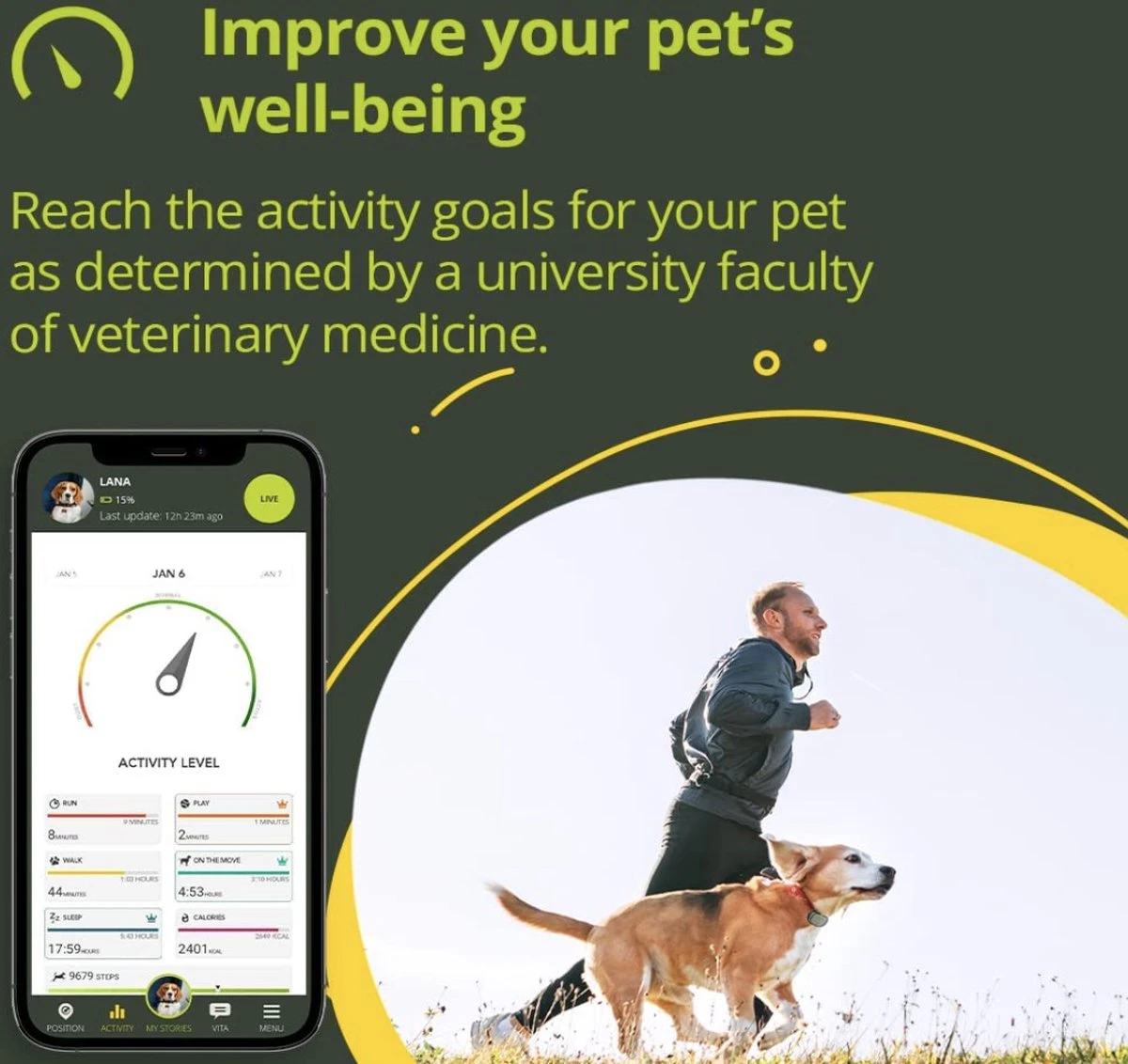 - ACTIVITEITSMETING – Je kan stappen, wandel minuten, rennen, speeltijd, slaap & verbruikte calorieën van uw huisdier meten en gegevens vergelijken met officiële parameters van de diergeneeskundige uni
