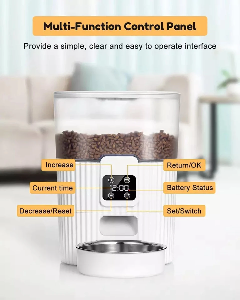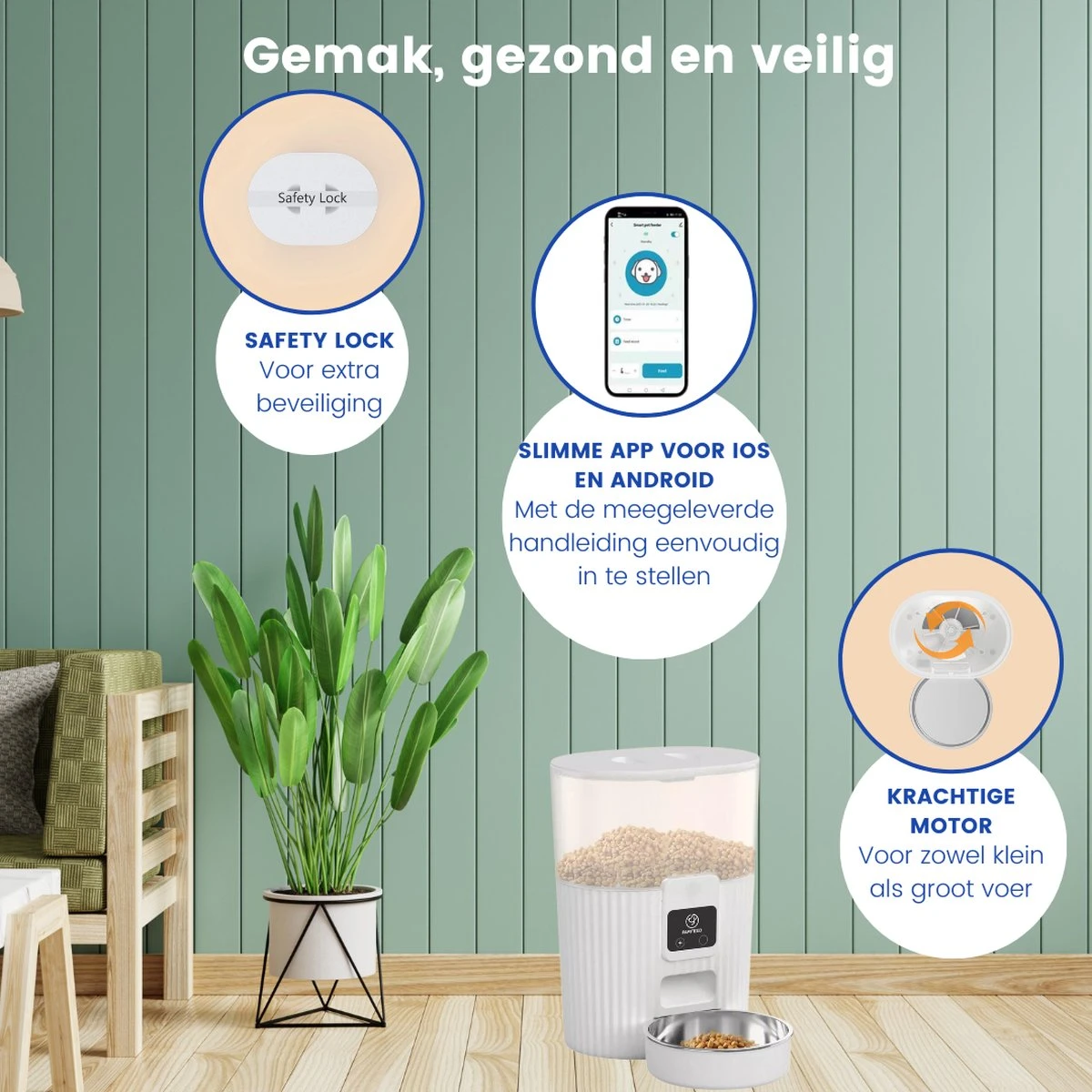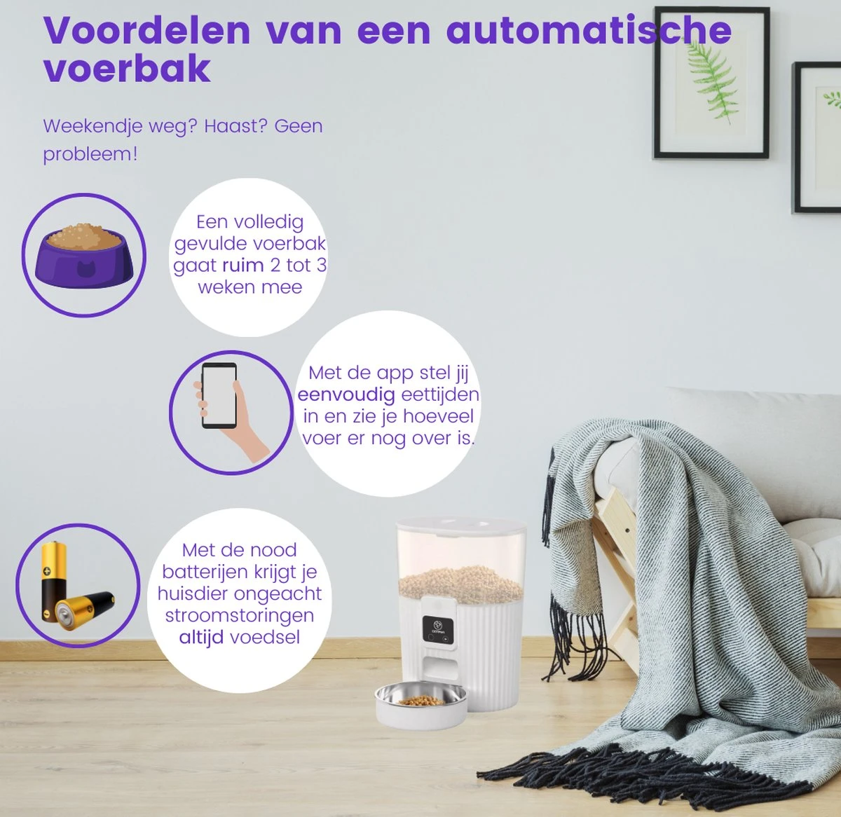 Met de app zorg je ervoor dat je niet moeilijk met knoppen aan de gang hoeft, maar rustig op jouw smartphone of tablet kunt aangeven op welke tijdstippen jouw huisdier te eten krijgt. Ook kun je de hoeveelheden aangeven via de app. Hoe vind je die mooie app nou? Op de automatische voerbak staat een QR-code die jou doorverwijst naar de app.