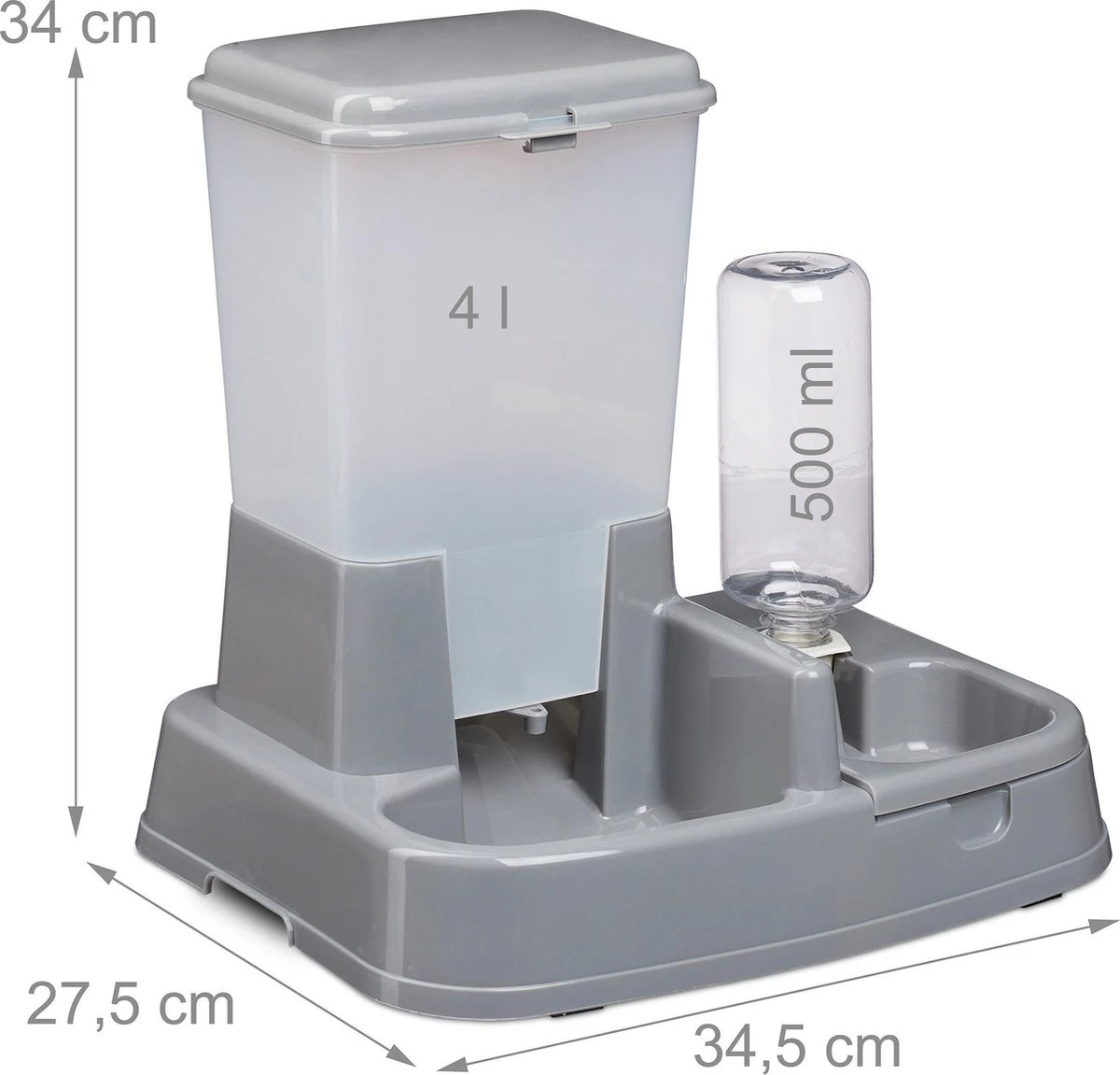 Deze praktische eet-en drinkbak is zowel geschikt voor honden als voor katten. In de houder kan je een hoeveelheid van max. 4 liter droogvoer vers houden. Het voer kan je met behulp van het schuifklepje handmatig in porties verdelen. Je kan echter ook de opening open laten waardoor er steeds nieuw voer uitkomt. Dankzij het waterflesje is ook water steeds voorzien. Je draait het flesje gewoon vast in de houder en het water komt vanzelf op constante hoogte in de drinkbak terecht.