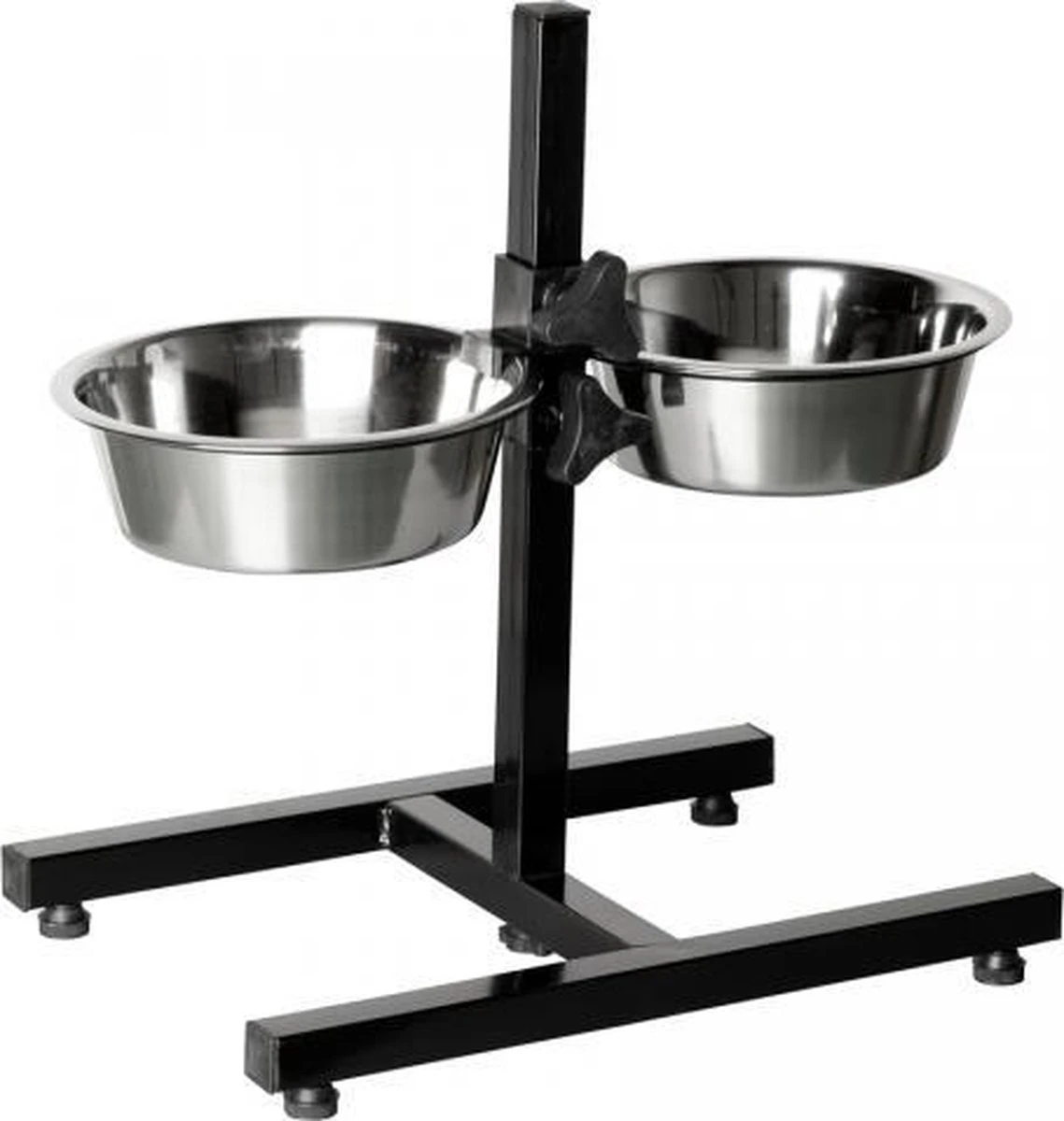 H-standaard inclusief RVS voerbakken. Deze standaard is voorzien van noppen aan de onderzijde om er voor te zorgen, dat de standaard steviger staat, en is in hoogte verstelbaar. Ideaal voor de spijsvertering van uw huisdier.