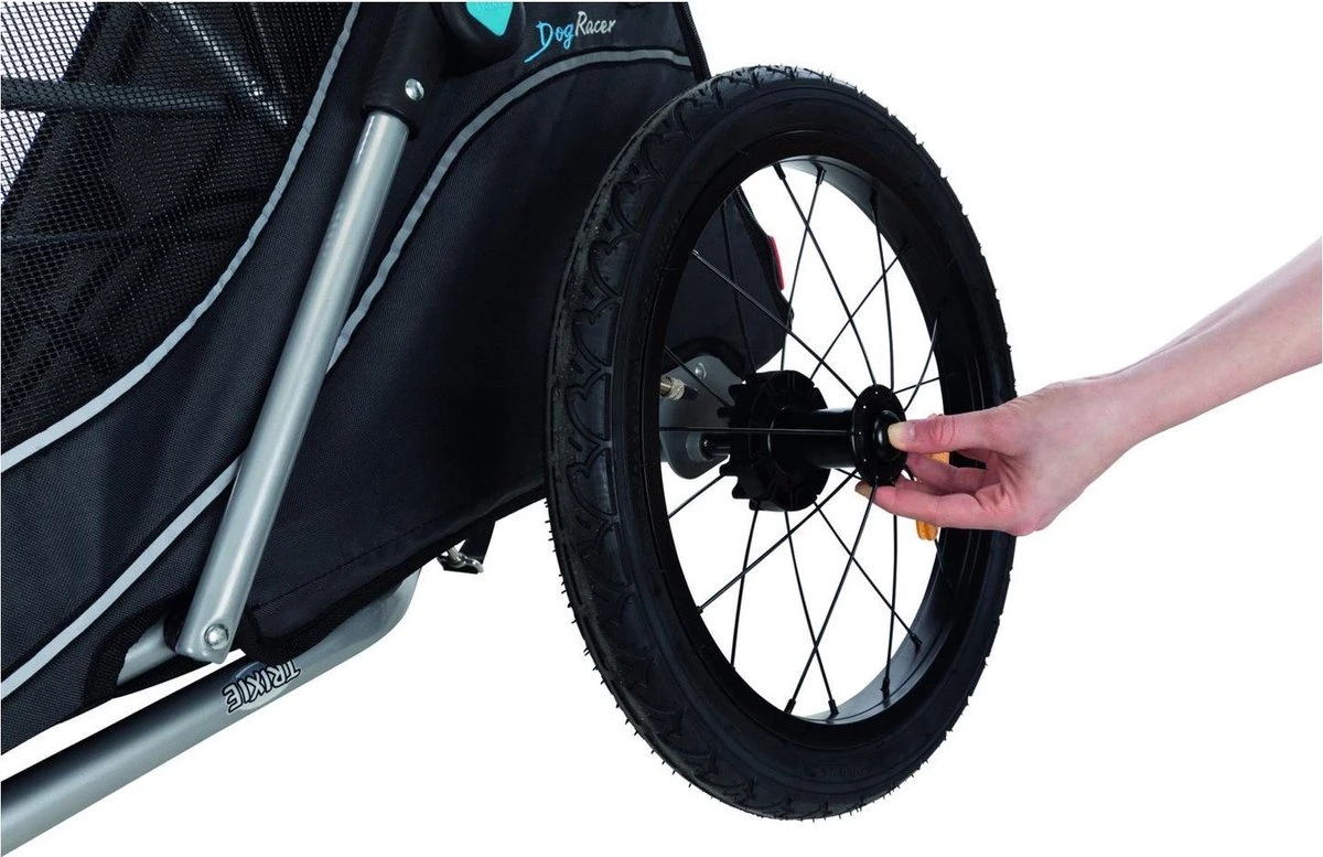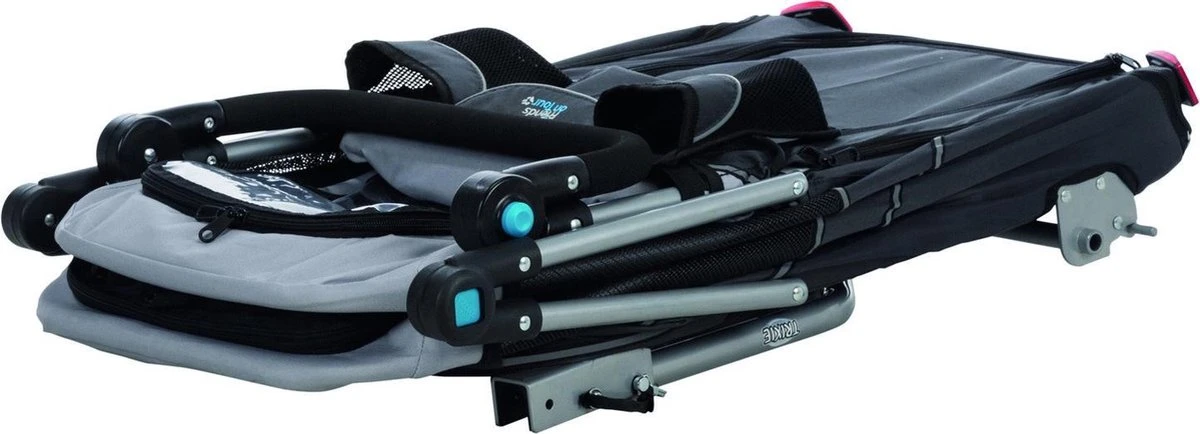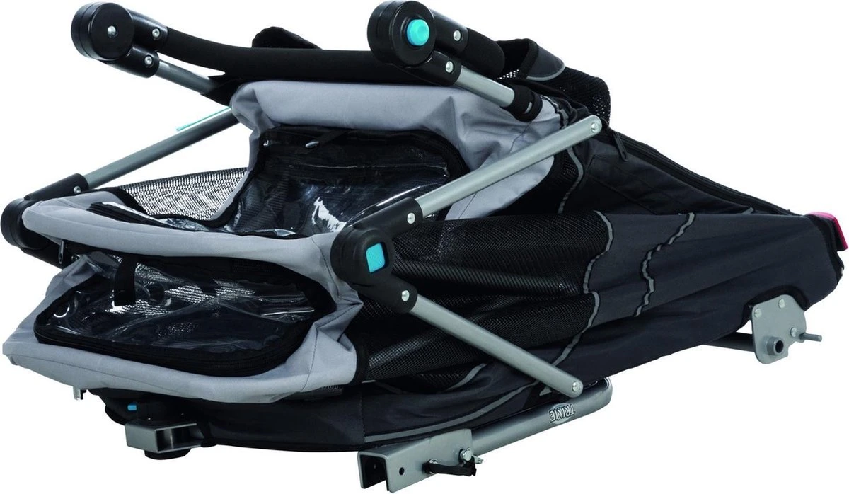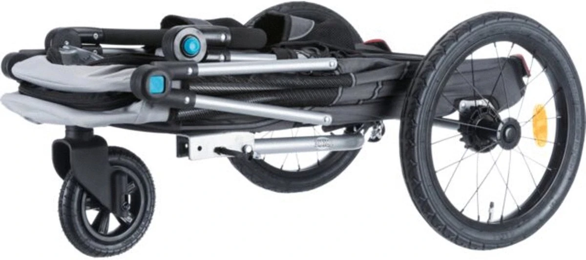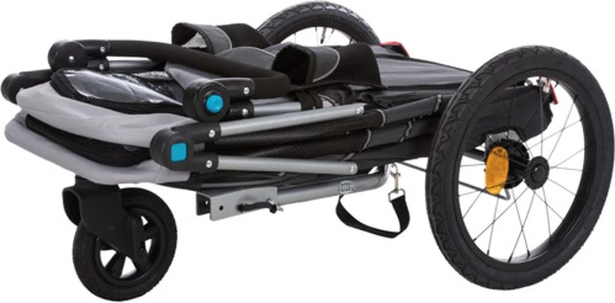 De fietskar is makkelijk in te klappen en compact op te bergen en komt met koppeling. En nog beter? Je kunt de fietskar heel gemakkelijk ombouwen tot een buggy met het los verkrijgbare voorwiel!
