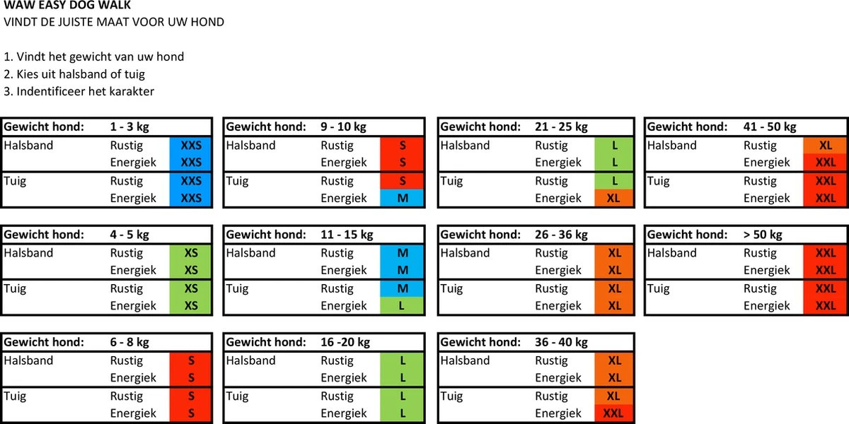 Kies de juiste maat door middel van gewicht, tuig/ halsband en karakter van uw hond.